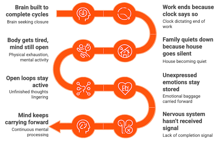 "I used to lie down but my mind kept running. Now my day ends properly — and sleep follows."